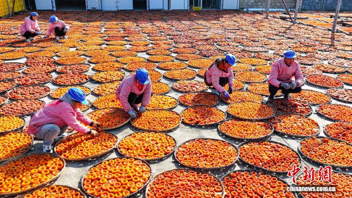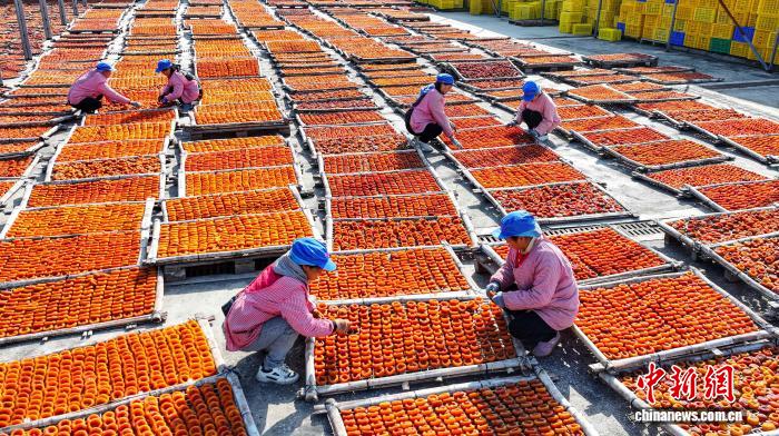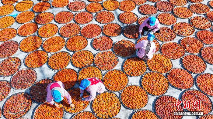 图为仄乐县沙子镇添工企业工人正在翻晒柿饼。(无人机像片)杨宗衰 摄
